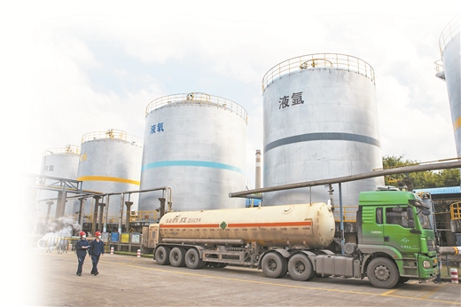 厂区内,高耸入云的空分塔与各式液体贮槽映入眼帘,来自各地的槽车正有序等待充装液体产品。